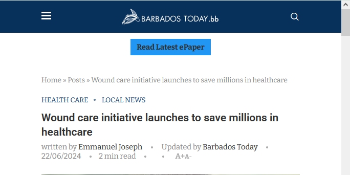 From the Barbados Today article: A new regional wound care initiative has been launched here to reduce healthcare costs by millions of dollars and lower amputation rates in Barbados, said to be among the world’s highest. The Caribbean Wounds Network (CariWN), a public-private partnership, seeks to prevent infections and improve patients’ quality of life through collaboration with a knowledge network and community of practice. Dr Simone McConnie, founder and chair of CariWN, told Barbados TODAY: “CariWN has been set up to address the pressing issue of wound care within the Caribbean region. With an annual cost estimate of $7 billion, the need for coordinated action has never been more urgent. Read the full article here: ehttps://barbadostoday.bb/2024/06/22/wound-care-initiative-launches-to-save-millions-in-healthcare/